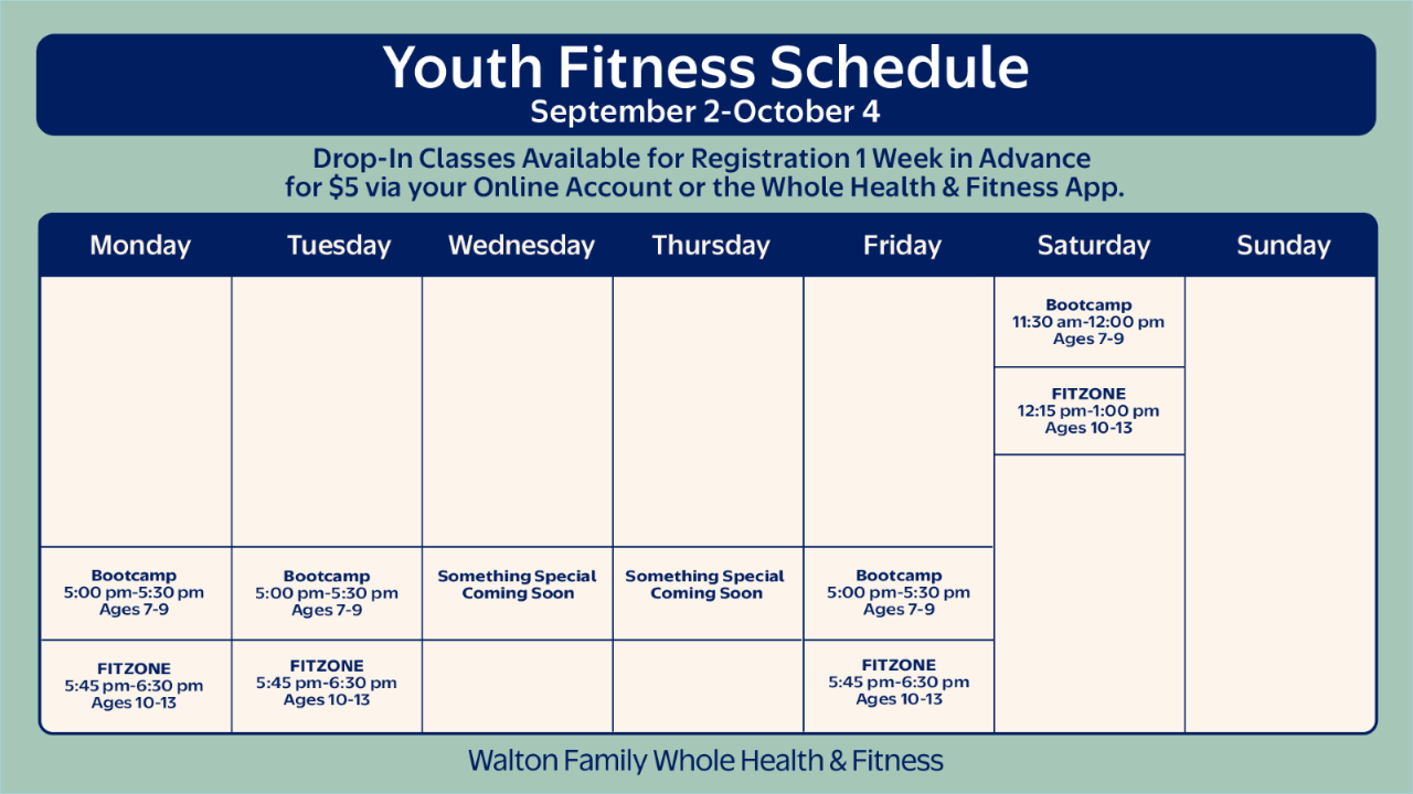 Looking for fun and active ways to keep your kids engaged, but need some flexibility? Check out our drop-in style youth fitness classes, perfect for ages 7-9 and 10-13. Only $5 per drop-in, all in YAC Studio 2. Register up to a week in advance by logging into your online account at walmart.clubautomation.com or in the Whole Health & Fitness app under "Classes".